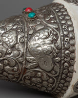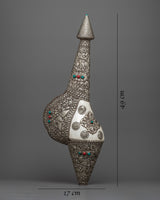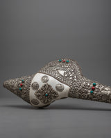Incorporate this gemstone-inlaid Shankha into your spiritual rituals or as part of your home decor to bring peace and serenity into your life. The harmonious combination of white metal and vibrant gemstones creates a captivating piece with spiritual significance, ideal for those who value the fusion of traditional craftsmanship and aesthetic beauty.
