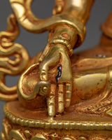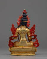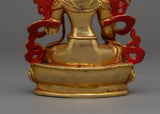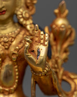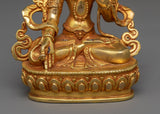 This excellent statue has a copper body that has been skillfully crafted and is gilded in 24K gold. Gold and acrylic paintings accentuate the fine details of White Tara's expression and the elaborate patterns on her clothing, giving the picture more depth and vitality. Its substantial presence and weight of 0.326 kg make it perfect for any area used for spiritual development, meditation, or observation.
