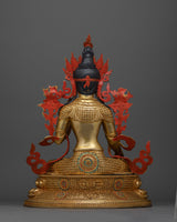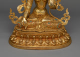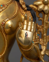 The statue has a bright and divine aspect thanks to its skillfully crafted copper body and 24K gold gilding. Vibrant gold and acrylic paintings accentuate the fine details of White Tara's serene look and the lovely patterns on her attire. The use of intricately cut gemstones gives a luxurious touch that heightens the statue's overall grandeur. The intricate floral motifs carved onto her crown and jewelry, as well as the lotus patterns adorning her robes, are prime examples of the artisans' attention to detail and perfection. At 8.29 kg, this heavy item creates a beautiful focal point in any meditation or spiritual area, bringing in a sense of safety and tranquility.