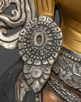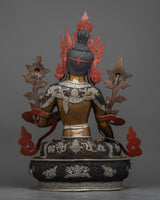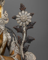 Presenting the White Tara Copper Sculpture: a depiction of the female Bodhisattva known for her functions in healing, compassion, longevity, and nurturing of mothers. This sculpture perfectly captures the essence of White Tara's protective grace and caring attitude. It measures an astounding 25.9 inches tall on a 14.9-inch base and weighs 17.48 kg. This item, plated in silver and features gold and acrylic paintings on an oxidized copper body for a timeless and calm appearance, represents White Tara's protective embrace and profound spiritual well-being.