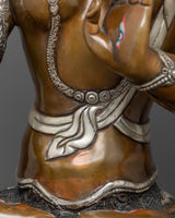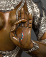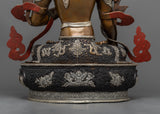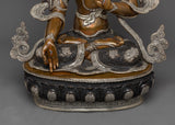 White Tara is depicted in a seated position, her seven eyes (including those on her forehead, palms, and soles) symbolizing her omniscient awareness of the suffering in the world and her readiness to offer her blessings and protection. The silver plating over the oxidized copper body illuminates her form with a divine glow, signifying the purity and boundless compassion of White Tara. The meticulous gold and acrylic paintings enrich her compassionate gaze and the intricate details of her attire, inviting meditation and reflection on her qualities of patience, loving-kindness, and benevolent action.