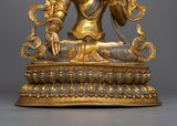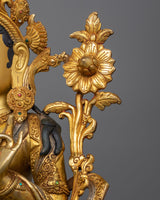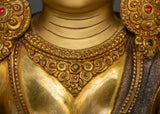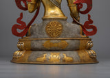 The White Tara Figure, a symbol of mother compassion, longevity, and health, transports you to a state of serenity and healing. With her seven eyes, which represent her watchful concern for all creatures, this beautiful statue, standing at an amazing 19.29 inches, perfectly portrays the essence of White Tara. Carefully fashioned from copper and adorned with 24K gold gilding, this statue is complemented by vibrant acrylic and gold paintings, as well as hand-carved gemstones that lend an air of grandeur and complexity to its appearance.