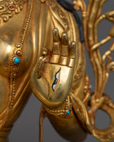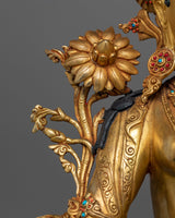 This marvelous statue has a copper body that has been skillfully crafted and is gilded in 24K gold. Vibrant gold and acrylic paintings accentuate the fine details of White Tara's look and the elaborate patterns on her attire, giving the picture more depth and vitality. Its substantial presence and weight of 8.52 kg make it perfect for any area used for spiritual development, meditation, or introspection. To evoke the compassion, longevity, and spiritual clarity of the Bodhisattva, place this 50cm White Tara Gold-Gilded Statue in the heart of your house, temple, or spiritual center.