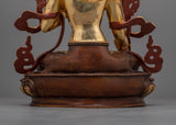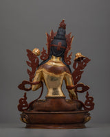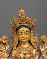 The White Tara Spiritual Decor Figurine is a depiction of the Goddess of Compassion and Healing, who brings calm, longevity, and spiritual protection. Handcrafted with a copper body gilded in 24K gold, with delicate gold and acrylic paintings highlighting fine creativity. This figurine weighs 4.21 kg and stands at 13.6"/34.5cm in height with a base of 9.6"/24.5cm, making it an amazing centerpiece for any altar or sacred place.