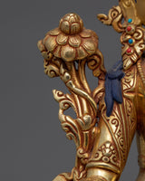 The White Tara Tibetan Bodhisattva Figurine, a 10.2" tall handmade work representing healing, compassion, and knowledge, radiates timeless grace. This statue, which is made of a copper body and is gilded in 24K gold, has acrylic and gold paints that vividly depict White Tara's sacred presence. This graceful artwork, which weighs 3.01 kg, is ideal for altars, meditation areas, or spiritual home decor.