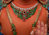 This statue is expertly constructed with a copper body and 24K gold plating. The entire body is painted a bright orange, echoing traditional iconography that represents Manjushri's wisdom and learning. The gold and acrylic paintings contrast with the orange hue, emphasizing the fine details of Manjushri's features, such as his sword of wisdom and book of ultimate knowledge.