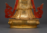 Bring Wise Manjushri, the Bodhisattva of Wisdom, into your spiritual space with this beautifully sculpted statue. The Manjushri statue, made of copper and gilded in 24K gold, is an amazing work of art that portrays Patan, Nepal's rich cultural legacy. The gold and acrylic acrylics highlight the statue's features, resulting in a bright emblem of knowledge and enlightenment.