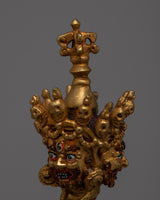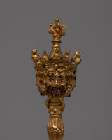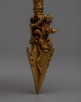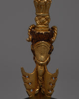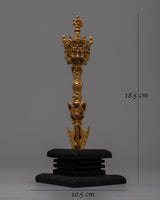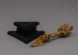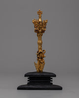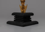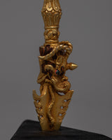 With its exquisite gold-plated copper body and handcrafted masterpiece, the Wooden Base Phurba will elevate your spiritual practice. This phurba, which stands 18.5 cm tall, has a gorgeous wooden base that complements its exhibition and religious presence. This holy object's deep spiritual significance and extensive history are reflected in its elaborate decorations on the blade and its symbolic features on the grip. Any spiritual collection or practice would benefit greatly from the addition of this exquisite and long-lasting gold plating.