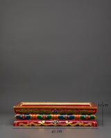 The Wooden Tibetan Tray is a beautifully carved tray suitable for spiritual rituals and offerings. This magnificent piece is 10cm high and 41cm wide, with a side width of 31cm, providing a balanced and expansive surface for your rituals. This tray is both utilitarian and ornamental, making it ideal for Tibetan Buddhist rituals, meditation activities, or simply adding to your altar area. This tray, crafted from solid wood and accented with brilliant acrylic colors, serves as a stunning backdrop for all your spiritual practices.