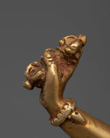 This Wrathful Deity Chana Dorje (Vajrapani) Sculpture, stands at a height of 10.8 inches (27.5 cm) with a base width of 9.1 inches (23 cm), presenting a powerful and dynamic representation of the Bodhisattva of Power. Crafted from a copper body and adorned with 24K gold gilding, the statue exudes strength and spiritual energy.