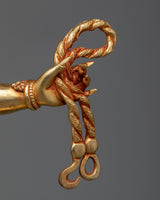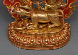 Masterfully hand-crafted on a copper body and gilded in genuine 24k gold. The destroyer of death stands above, riding a water buffalo and depicted with a wrathful buffalo's head. He holds khatang and a lasso while his consort is on the left with a wrathful expression.