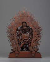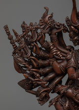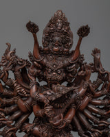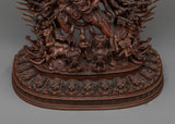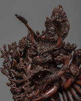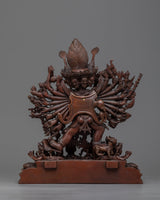 Our Yamantaka sculpture combines spiritual symbolism with beautiful skill. The exquisite elements of the deity's shape are carved to perfection, from the ferocious countenance to the numerous arms, expressing the essence of this powerful Buddhist figure. This oxidized copper statue is not only a portrayal of Yamantaka but also a monument to the exceptional craftsmanship of our Nepalese artists and their commitment to preserving the ancient history of Buddhist creativity.