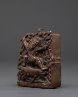 The wrathful deity carving showcases Yamantaka in his fierce manifestation as the destroyer of death and ignorance. The central figure displays multiple faces representing his omniscient awareness, with bulging eyes that pierce through illusion and a terrifying expression that frightens away hostile forces. Surrounded by a dynamic flame aureole symbolizing the burning away of obstacles and delusions, Yamantaka tramples upon figures representing conquered demons and ego. The ornate Buddhist art includes flowing cloud motifs, decorative scrollwork, and traditional Tibetan design elements that frame this powerful protector. Each carved detail in this portable altar tells part of the greater story of spiritual transformation and divine protection.