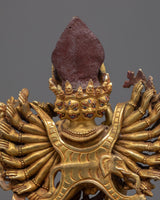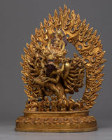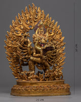 We have exquisitely hand-sculpted the Yamantaka With Consort Sculpture in a traditional Himalayan style made in Nepal. In the statue, we have depicted the deity alongside his consort. Our skillset for crafting such a piece of art has been passed on for generations. The art style of this figurine is quite complex. It took us months and months of hard work and dedication to handcraft every aspect of the statue. Intricate design patterns have been hand craved as well. We have molded the body using copper and glided with 24K pure gold. You can use this figurine for different Buddhist Rituals and practices. We assure you that the materials used for the statue are of the highest quality.