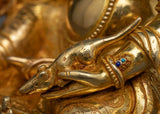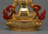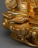 This sculpture, which is covered in 24K gold gilding and has detailed acrylic and gold paintings on its copper body, is a symbol of Yellow Dzambhala's wealth-attracting vitality. Yellow Dzambhala, who is associated with wealth, charity, and moral success, can inspire abundance in all its forms when he is present at your home shrine.