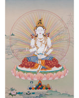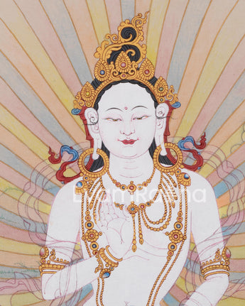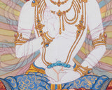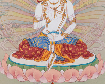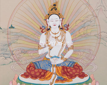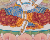 This handpainted dakini Yeshe Tsogyal thangka art piece skillfully portrays the Buddhist deity, representing wisdom, compassion, and inner strength. According to tradition, displaying this thangka in your home or meditation space can bring spiritual guidance and inspiration.