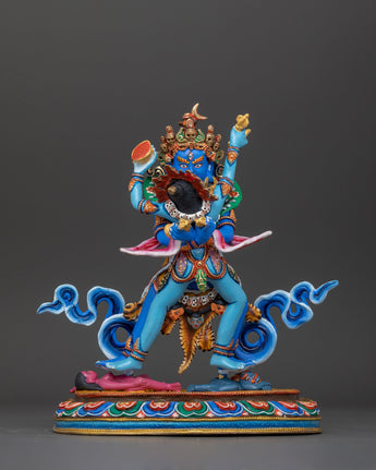 The Chakrasambhara with Consort statue is a stunning depiction of the heavenly union of knowledge and compassion. This statue stands 11.4 inches tall, with a 10-inch base, and weighs 4.09 kg. It is crafted of high-quality copper. It is embellished with 24K gold gilding and elaborate gold and acrylic paintings, which symbolize the tantric deity's strength and beauty. This piece's workmanship is exquisite, representing the transformational powers of Chakrasambhara and his spouse.