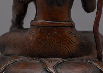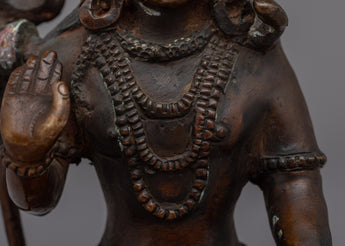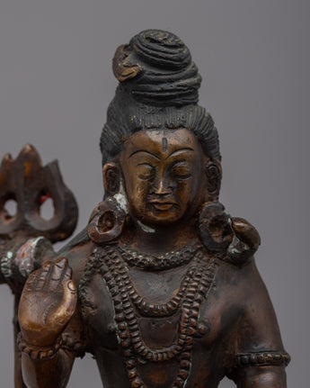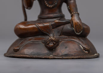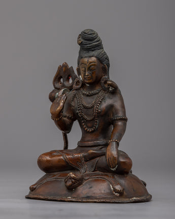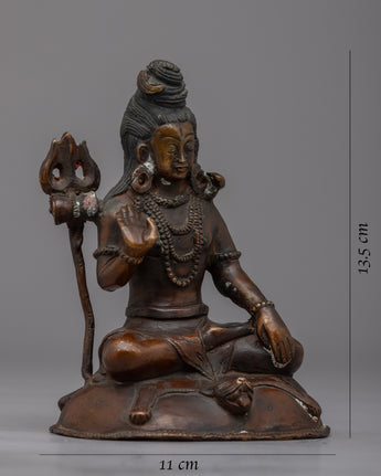 Introducing the spellbinding Yogi Shiva Statue, a real representation of majesty and peace. This magnificent work of art, which is painstakingly handmade on a copper body and captures the essence of Lord Shiva in his relaxed state of meditation. The deity's benevolent presence fills the area with peace and spirituality as he sits on the lotus base, encircled by a serene aura. Next to him, the iconic Trishul, which stands for the forces of creation, preservation, and destruction and symbolizes the harmony of the cosmos, rests gracefully. The Yogi Shiva Statue radiates wisdom and enlightenment and extends a compassionate hand of blessing to those who seek to set out on a profound spiritual journey. Experience the mystical energy of Lord Shiva's divine grace by submerging yourself in the divine aura of this exquisite statue.