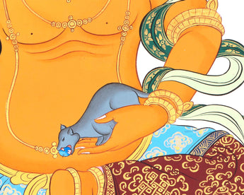 Zambala sits on a lotus, holding a mongoose named Nehulay, which spews forth precious jewels and ornaments. He is said to be able to grant wishes and help increase financial abundance.