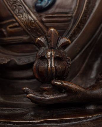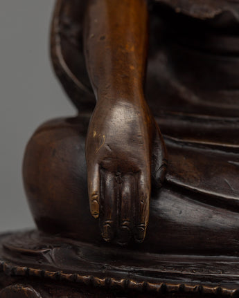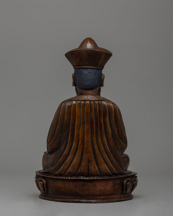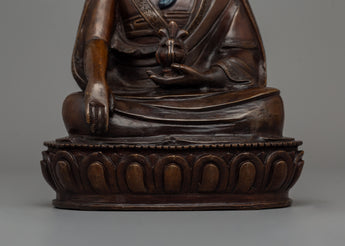 The statue's design is heavily symbolic. Zhabdrung Rinpoche is seated meditatively, exuding both authority and calm. His posture reflects that of a teacher and protector, offering guidance and blessings. The folds in his robes are elegantly detailed, with special attention paid to each crevice and line, emphasizing the craftsmanship involved. The oxidized finish gives the statue an aged and venerable appearance, transforming it from a spiritual artifact to a decorative piece with cultural and historical significance. The Zhabdrung Rinpoche Statue is a stunning representation, ideal for collectors or those who want to honor this pivotal figure in Bhutanese history and Buddhist tradition.