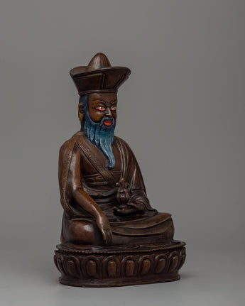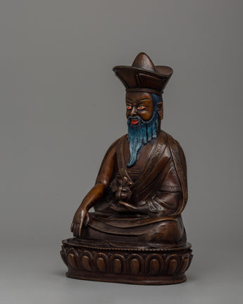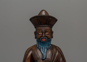 The Zhabdrung Rinpoche Statue, made of oxidized copper, stands 24 cm tall and 16 cm wide, capturing the revered figure of Bhutan's spiritual leader in exquisite detail. Zhabdrung Rinpoche, a central figure in Bhutanese Buddhism, is depicted wearing traditional attire, including a crown and robes, with a serene yet commanding expression. His beard and mustache are meticulously crafted to represent the wisdom and leadership of this significant historical figure.