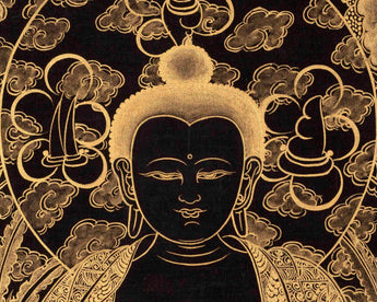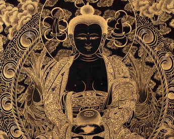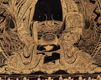 Amitayus, an aspect of Amitabha, represents the Buddha of Infinite Life and embodies the aspiration for a long and fulfilling life. This Thangka, crafted with meticulous care, showcases Amitayus Buddha in a mesmerizing black and gold style, infusing the artwork with a sense of regality and sacredness.