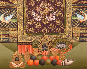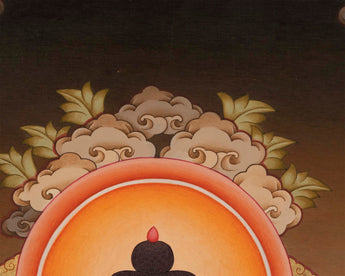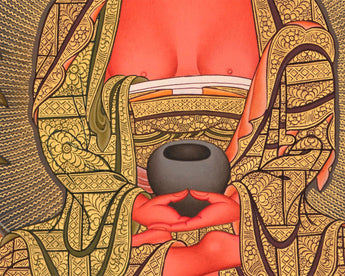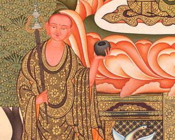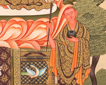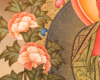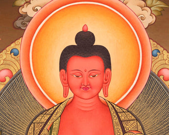 The Amitabha Buddha is shown on our buddhist thangka, which was traditionally painted by hand. The artwork is finished with 24K gold and shades of natural stone.