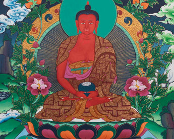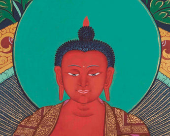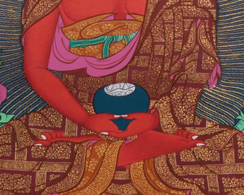 The Amitabha Buddha Thangka Painting depicts Amitabha Buddha seated gracefully on a lotus throne, exuding a serene aura of compassion and enlightenment. Amitabha, revered as the Buddha of Infinite Light, is known in the Buddhist tradition for his Pure Land, a realm of bliss and liberation where beings can attain enlightenment. He is often portrayed with a gentle smile, symbolizing his welcoming nature and boundless compassion towards all sentient beings.