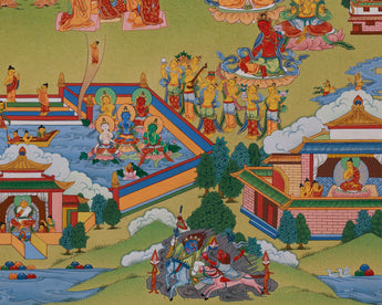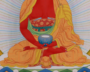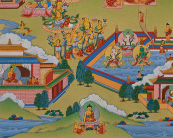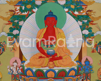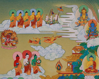The Mahayana Pure Land is Amitabha Buddha's realm, a paradise of awakening that transcends suffering and delusion. This hand-painted thangka, created in the Enlightenment Studio, features natural stone colors and 24K gold. The colors from Himalayan minerals provide soft, earthy tones with timeless depth. The 24K gold adds sacred brilliance to the jewelry, garments, throne, and celestial elements, bringing divine figures to life. It follows the principles of the Karma Gadri style, known for its spacious composition, gentle landscapes, and graceful figure proportions.