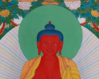 At the center, he is depicted with a serene expression, holding an alms bowl filled with nectar, representing spiritual nourishment and inner peace. Along with Avalokiteshvara and Mahasthamaprapta, he forms a divine triad guiding entities toward enlightenment. Amitabha's Pure Land teachings are especially embraced in East Asian and Tibetan traditions, offering a deeply accessible path to awakening through devotion, faith, and remembrance.