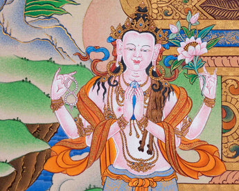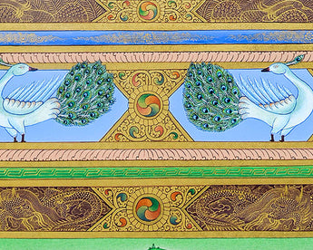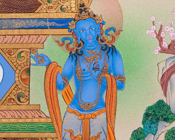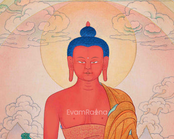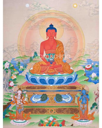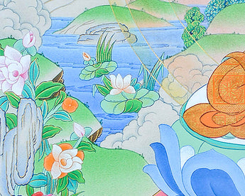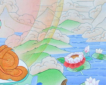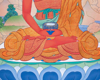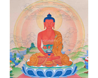 The Amitabha Buddha Thangka offers a tranquil portrayal of boundless compassion and enlightenment. This thangka, carefully painted by hand, captures Amitabha Buddha, the embodiment of Infinite Light and Life, in vibrant natural stone colors heightened by Genuine 24K Gold. Crafted on high-quality cotton canvas, it showcases the refinement and depth characteristic of the Karma Gardi style, known for its intricate details and spiritual significance. The thangka depicts Amitabha Buddha in a serene and benevolent form, evoking a sense of peace and spiritual contemplation. Beyond its aesthetic appeal, this artwork is a testament to Nepalese craftsmanship, infusing spaces with a calming presence and serving as a focal point for meditation on the teachings of Amitabha Buddha. It transcends being merely visually pleasing, emerging as a profound spiritual instrument that facilitates contemplation on enlightenment and the pure land of bliss associated with Amitabha.