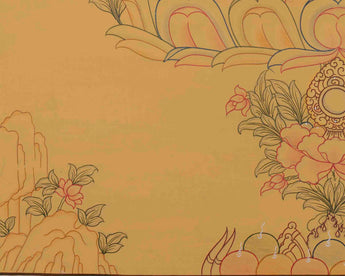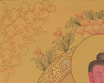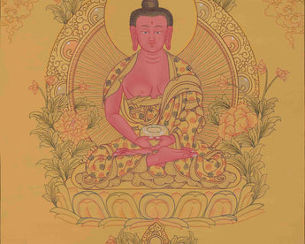 The Amitabha Buddha is on our thangka, which was traditionally painted by hand. The artwork is finished with natural stone colors and 24K gold.
