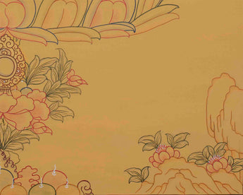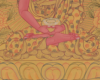 Amitabha Buddha, also known as Amitayus or Amituofo, is a highly regarded figure in Mahayana Buddhism, particularly Pure Land Buddhism. He is also known as the Red Buddha and is portrayed in this thangka with a red complexion to represent his qualities and the Pure Land he rules over. Amitabha is renowned as the compassionate guide to the Pure Land, a place of bliss and enlightenment where creatures can be reborn through dedication and faith. His teachings emphasize the power of faith and dedication to make enlightenment acceptable to all beings, regardless of spiritual degree or upbringing. Amitabha Buddha represents unbounded compassion, wisdom, and infinite light, providing comfort and direction to beings who are trapped in the cycle of birth and death. His label as the "Red Buddha" emphasizes the profound symbolism associated with his compassionate nature and the transformative power of his teachings.