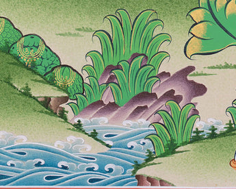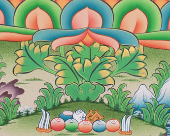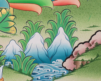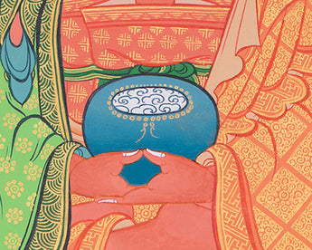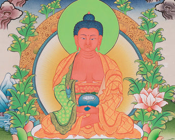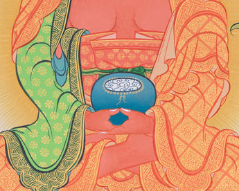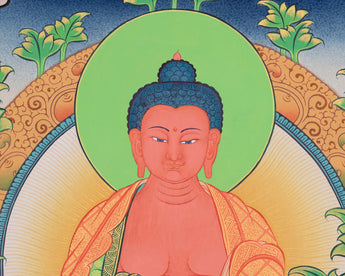 The Buddha of Infinite Light Thangka captures the essence of transcendental radiance and boundless compassion embodied by Amitabha Buddha. In this sacred artwork, Amitabha Buddha is depicted seated upon a lotus throne amidst a luminous realm, radiating an aura of serene wisdom and infinite love. His hands are often positioned in the gesture of meditation, symbolizing inner tranquility and profound contemplation. Adorned with vibrant colors and intricate details, evoking the splendor of the Pure Land—a realm of ultimate bliss and enlightenment. The Buddha of Infinite Light Thangka serves as a visual gateway to the spiritual realm of Amitabha Buddha, inviting devotees to immerse themselves in the transformative power of his compassionate presence. Through its intricate symbolism and radiant imagery, this sacred artwork inspires practitioners to aspire towards enlightenment and find solace in the eternal glow of Amitabha's infinite light.