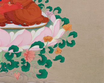 This Tibetan Amitabha Buddha Thangka is a hand-painted masterpiece created in our Enlightenment studio on high-quality cotton canvas. It features vibrant acrylic colors and is accented with 24K gold. All details, from the glowing halo to the delicate lotus petals, are meticulously painted in the traditional Karma Gadri style, renowned for its clarity and spaciousness. The ruby-red figure of Amitabha stands out against a subtle background, while the lotus throne, moon disc, and monk’s bowl are enhanced with layered pigments, adding both depth and spiritual radiance.