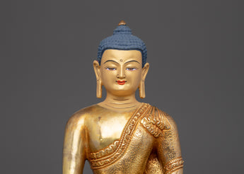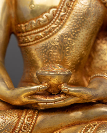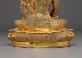 The Serene Amitabha Buddha Sculpture is a remarkable representation of the Buddha of Infinite Light, standing 26.5cm tall and 20.5cm wide, with a weight of 2.41kg that conveys its substantial presence. Expertly handcrafted from copper and finished with a electro gold plating, this statue captures the profound compassion, wisdom, and spiritual guidance that Amitabha Buddha embodies. The serene expression and meditative posture evoke an immediate sense of peace, mindfulness, and clarity, transforming any meditation space, altar, or sacred area into a sanctuary of calm and devotion. Every detail, from the intricate folds of the flowing robes to the finely sculpted facial features and meaningful hand gestures, showcases meticulous craftsmanship that brings the figure to life. The electro gold plating not only enhances the sculpture’s divine aura but also reflects light, amplifying Amitabha’s spiritual presence and creating a luminous focal point in your sacred setting.