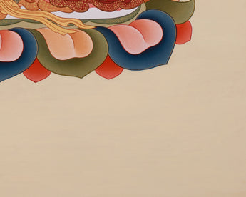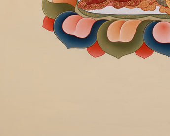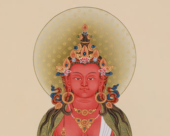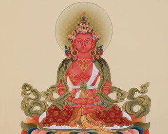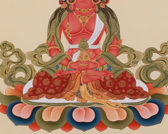 Transform your spiritual space with the Amitayus, Buddha of Infinite Life, an artwork that embodies longevity, wisdom, and boundless compassion. He is shown seated on a lotus base, symbolizing his purity and his ability to grant eternal blessings to his devotees; his red form symbolizes life's vitality and energy. This stunning thangka preserves the rich heritage of Tibetan art, meticulously hand-painted on premium cotton canvas. Vibrant acrylics enhance its dimensionality and intricate details, while genuine 24K gold imparts a sacred luminosity, signifying wisdom and enlightenment.