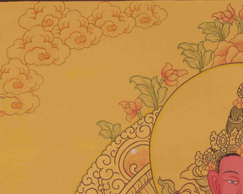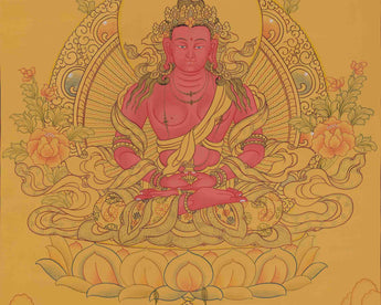 Amitabha Buddha, also known as Amitayus or Amituofo, is a highly regarded figure in Mahayana Buddhism, particularly Pure Land Buddhism. He is also known as the Red Buddha and is portrayed in this thangka with a red complexion to represent his qualities and the Pure Land he rules over. Amitabha is renowned as the compassionate guide to the Pure Land, a place of bliss and enlightenment where creatures can be reborn through dedication and faith. His teachings emphasize the power of faith and dedication to make enlightenment acceptable to all beings, regardless of spiritual degree or upbringing. Amitabha Buddha represents unbounded compassion, wisdom, and infinite light, providing comfort and direction to beings who are trapped in the cycle of birth and death. His label as the "Red Buddha" emphasizes the profound symbolism associated with his compassionate nature and the transformative power of his teachings.