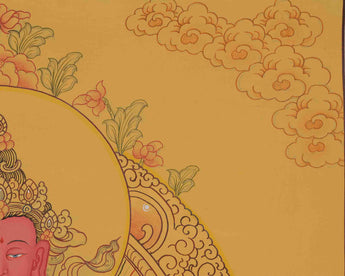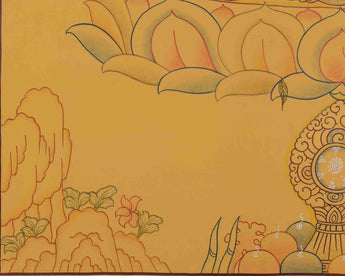 Amitayus Buddha is a highly admired figure in Mahayana Buddhism, particularly in the Pure Land tradition. In this particular thangka, he is portrayed in concentration, carrying a vessel of immortality in his left hand. His right hand is resting in blessings, representing his bestowal of long life, health, and spiritual vitality. The yellow background in these paintings is noteworthy because it has deep symbolism in Buddhist artwork, indicating wisdom, enlightenment, and good fortune. Yellow is related to the sun, which represents warmth and vitality. The thangka provides a serene and auspicious visual mood that invites viewers to reflect on Amitayus' infinite compassion and eternal life.