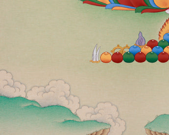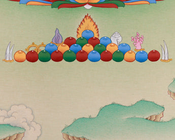 The Karma Gadri style, known for its fine details and clarity, brings Amitayus to life with precision and spiritual depth. Seated on a beautifully adorned lotus pedestal, he bestows the nectar of immortality, symbolizing his power to grant longevity and eliminate barriers to both physical and spiritual well-being. His poised and meditative stance encourages peace and introspection. The offerings surrounding him, jewels, a conch, and a crown, embody core Buddhist principles: purity, wisdom, and spiritual abundance. The flourishing trees and tranquil scenery surrounding Amitayus emphasize the serene environment conducive to the growth of his teachings, imparting a sense of calm and tranquility to the viewer.
