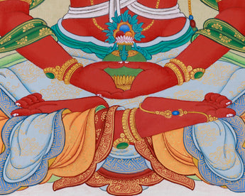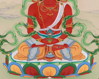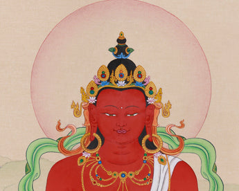 Invoke the blessings of Amitayus Longevity, the Buddha of Infinite Life, by connecting with his calm and powerful essence through this carefully hand-painted Thangka. Shown in vibrant red tones, Amitayus represents vitality, health, and spiritual energy, visually expressing boundless compassion. His tranquil meditation pose and the nectar-filled vessel signify his role as a giver of longevity and healing. Made with natural Lhasa stone colors and accented with genuine 24K gold, this Thangka acts as both a stunning piece of art and a spiritual tool, inviting longevity, wellness, and wisdom into your life. The traditional Karma Gadri style ensures that each brushstroke aligns with Buddhist teachings, making this Thangka a sacred enhancement to your meditation practice.