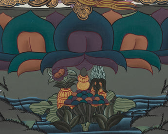 This radiant Amitayus Thangka Painting depicts the Buddha of Infinite Life in a lively and spiritually enlightening manner. This thangka was hand-painted by a Nepali artist using high-quality materials, including cotton canvas, acrylics, and genuine 24K gold. Intricate details and seamless transitions of light and shadow across the deity's figure are made possible by the painting's rich brightness and depth, which are achieved through the use of acrylic colors. Genuine 24K gold is meticulously used to provide an ethereal glow that highlights the Buddha's sacredness and enhances the artwork's luminosity, especially in the accents on the figure's robes, jewelry, and halo. Its traditional painting style ensures that the piece retains its cultural authenticity while showcasing the artist's painstaking skill, resulting in a masterwork that combines aesthetic beauty with spiritual depth.