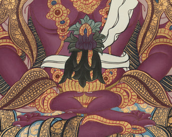 In Tibetan Buddhism, Amitayus is regarded as a potent deity of eternal life, spiritual energy, and wisdom. He is seated with a calm posture, exuding heavenly energy in red and purple hues that represent the living force, immortality, and sacred transformation. While his lavishly decorated robes, beautifully patterned in gold, symbolize spiritual nobility and transcendence, his serene demeanor and golden aura encourage tranquility and self-awareness. This Amitayus Thangka painting is ideal for meditation, altars, or religious décor. It bestows the gifts of longevity, clarity, and inner serenity.