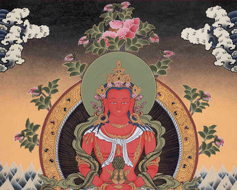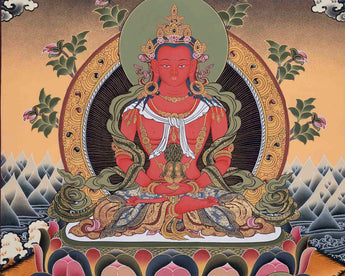 A sacred Tibetan Buddhist painting of the Buddha of Infinite Light and Infinite Life is called a Buddha Amitayus Painted Thangka. It shows Amitayus meditating while sitting still and appearing serene. The Thangka acts as a center for devotion, reflection, and wishes for long life and spiritual prosperity. It is painstakingly made with ancient methods and brilliant hues, enticing good vibes and encouraging spiritual development.