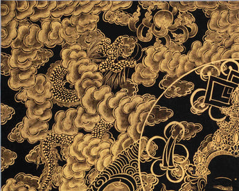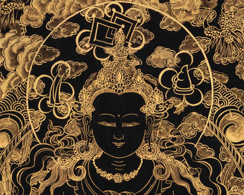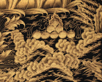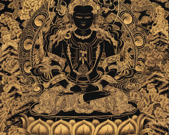The gold and black hand-painted Amitayus Buddha Thangka is revered as a symbol of transcendence and enlightenment. Carefully designed, it embodies the spirit of Amitayus Buddha, the Buddha of Infinite Life and Light, who is also regarded as Aparamita. It shows Amitayus Buddha in a calm state of meditation, radiating compassion and serenity. His left hand holds the vessel containing the elixir of immortality, signifying his ability to grant longevity and spiritual bliss, while his raised right hand makes a blessing gesture.