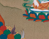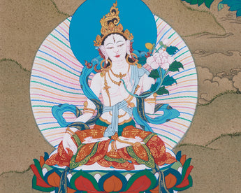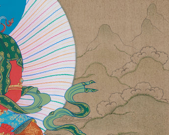 The Long Life Bodhisattvas—Amitayus Buddha, White Tara, and Namgyalma—are venerated for their capacity to bestow longevity and protection. This exquisite thangka painting honors their divine attributes of healing, compassion, and protection. Hand-painted in acrylics on high-quality cotton canvas and accentuated with genuine 24K gold, the artwork emanates luminous elegance. Created in the traditional Karma Gadri style, it symbolizes health, longevity, and inner serenity, rendering it a significant addition to any sacred space.