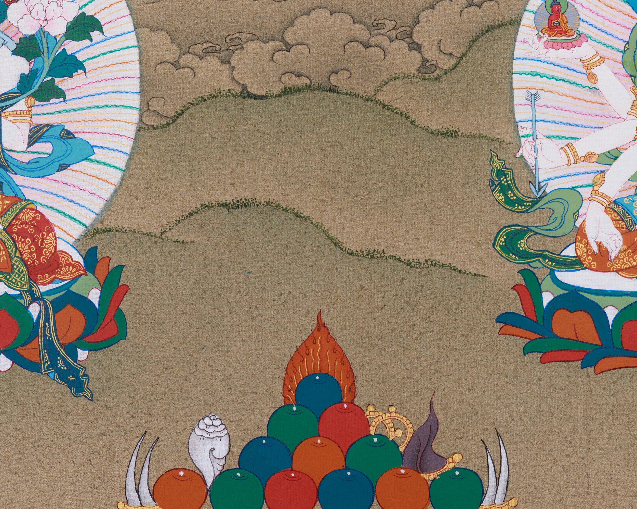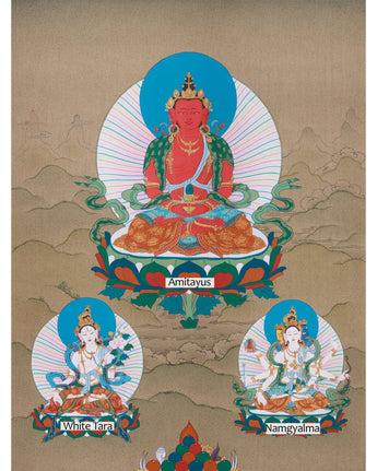 This harmonious depiction features Amitayus, the Buddha of Infinite Life, seated at the center, holding a vase of immortal nectar that symbolizes his divine ability to grant longevity and vitality. His glowing form radiates infinite compassion and the boundless essence of enlightenment, creating a calming and wise presence alongside the other two: White Tara and Namgyalma, each embodying distinct qualities. White Tara, smiling gently with seven watchful eyes, symbolizes healing and protection. Meanwhile, Namgyalma, with three faces and eight arms, symbolizes purification and the removal of obstacles, fostering well-being and spiritual resilience. Together, they offer a potent blessing of health, longevity, and spiritual strength for those who view this artwork.