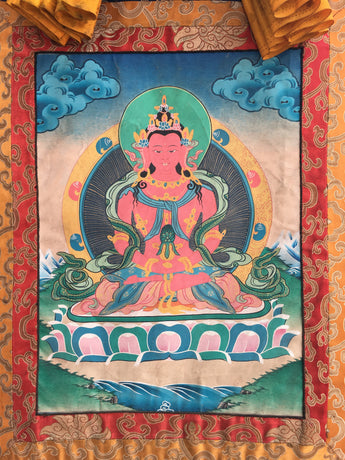 Vintage Amitayus Buddha Thangka |Brocade Mounted Tibetan Thangka | Spiritual Gift