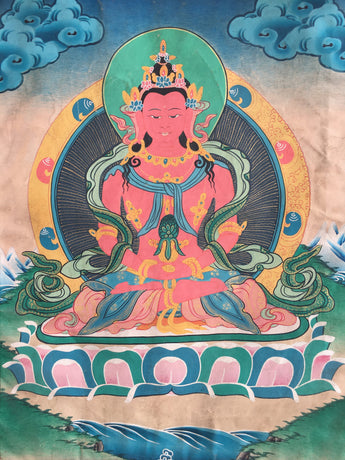 The vintage nature of this thangka suggests an aged and authentic piece, likely characterized by intricate details and traditional artistic techniques. The Vintage Amitayus Buddha Thangka is adorned with vibrant colors and symbolic elements, reflecting the artistic heritage of Tibetan Buddhist iconography.