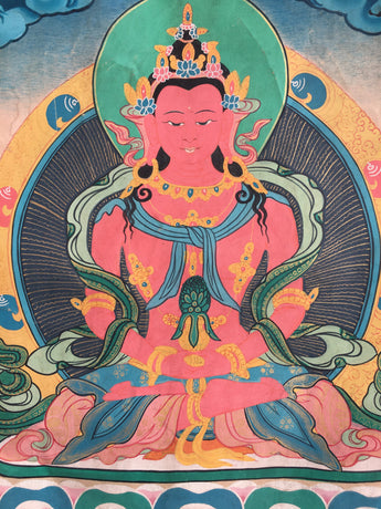 The Vintage Amitayus Buddha Thangka is a beautiful and culturally significant Tibetan Buddhist wall hanging thangka portraying Amitayus Buddha, a revered figure associated with longevity, abundance, and the preservation of life. Amitayus, also known as Amitabha in certain Buddhist traditions, is one of the Five Dhyani Buddhas and is particularly venerated in Pure Land Buddhism. This Buddha is depicted seated in meditation, holding a vessel containing the nectar of immortality (amrita) and a lotus, symbolizing purity.